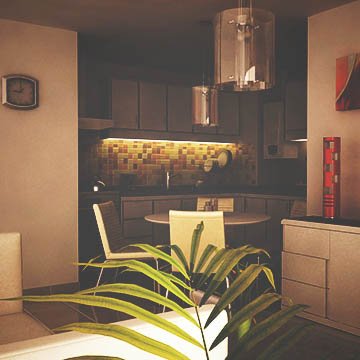 | Cocina con mesada de granito natural, bajo mesada, alacena superior, bacha doble, grifería monocomando, calefón y aparato de cocina |